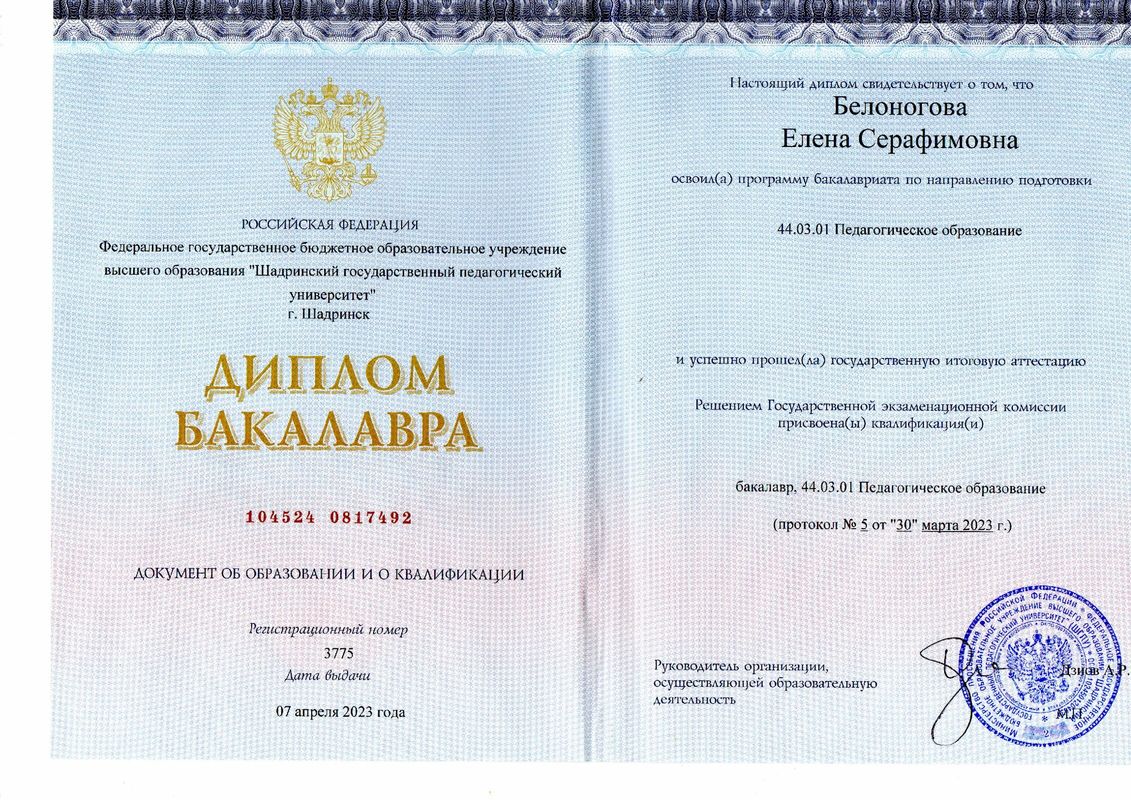 Я, Белоногова Елена Серафимовна, 1978 года рождения, занимаю должность воспитателя с 2019 года. Образование высшее - Шадринский государственный педагогический университет, дошкольное образование. Курсы повышения квалификации в 2023 году в ГАОУ ТО " ТОГИРРО" по теме: " «Актуальные проблемы и совершенствование организации образовательного процесса в условиях реализации ФГОС дошкольного образования", 2022; "Система сопровождения ребёнка с ОВЗ в общеразвивающем детском саду в условиях реализации ФГОС", 2023; "Внедрение Федеральной образовательной программы дошкольного образования", 2023 г . Общий трудовой стаж составляет 17 лет, педагогический стаж работы 6 лет.