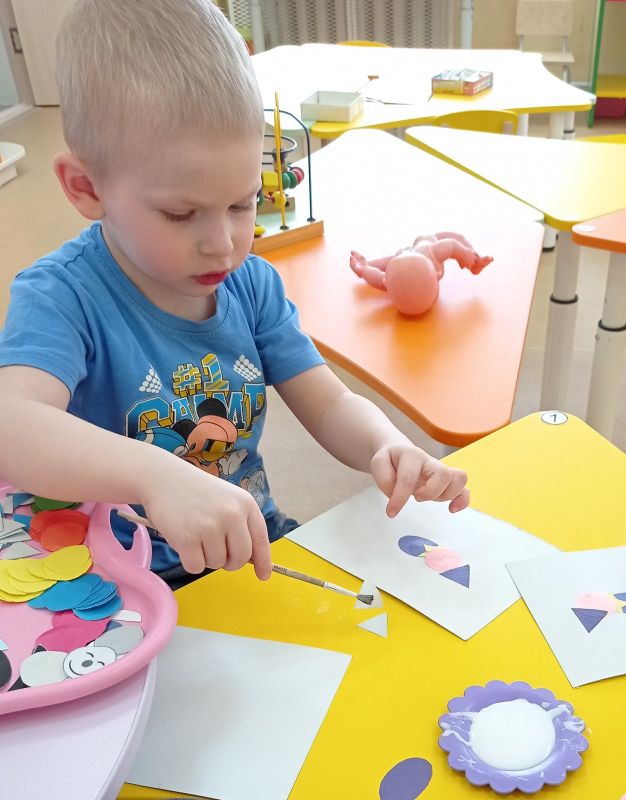 При выполнении этого интересного и ,в тоже время, сложного задания, дети повторяли геометрические фигуры, развивали эмоциональную сферу, изображали настроение. Детки закрепили приёмы наклеивания готовых фигур, учились ориентироваться на листе бумаги (справа, слева). Продолжали формировать знания детей о частях тела и лица.