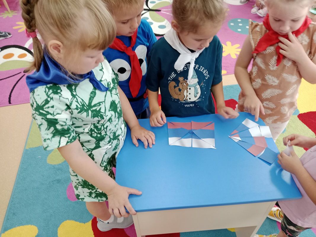 С ребятами была проведена беседа, где воспитатели знакомили детей с государственными символами России (флаг, герб, гимн), беседовали о стране, дети с интересом рассматривали иллюстрации, слушали пословицы и поговорки о нашей Родине, играли в дидактические игры "Узнай наш флаг", "Собери флаг", в старшей группе для детей был организован просмотр документальных фильмов "Флаг России - гордость наша".