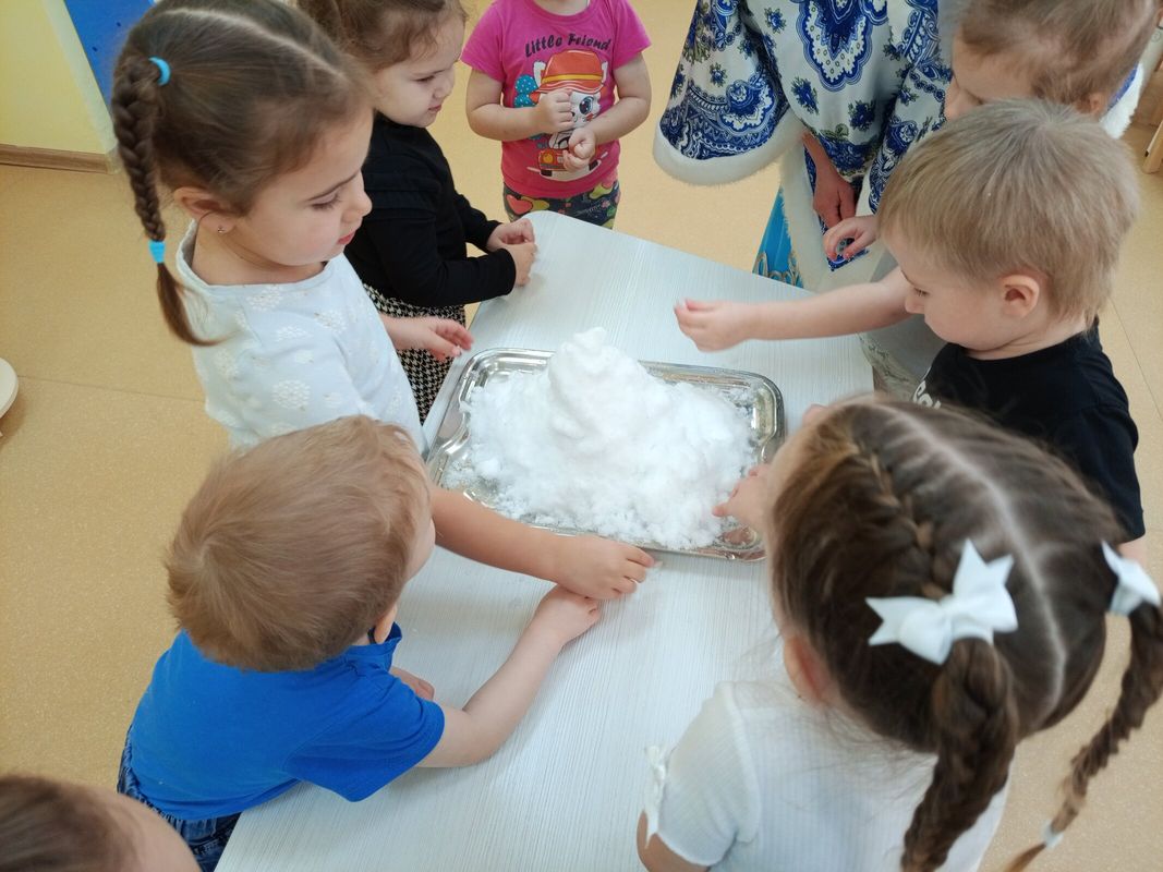 Зимушка - зима принесла с собой много снега, поведала детям об его свойствах. То, что снег состоит из воды, похож на мороженое, вату, молоко, облака, непрозрачный, мокрый, холодный, мягкий, рыхлый. И в завершении своеги визита Зимушка-зима предложила деткам окрасить снег гуашью в разные цвета и понаблюдать, как именно снег будет окрашиваться, с какой скоростью краска будет проникать в снежную толщу, как будут смешиваться цвета.