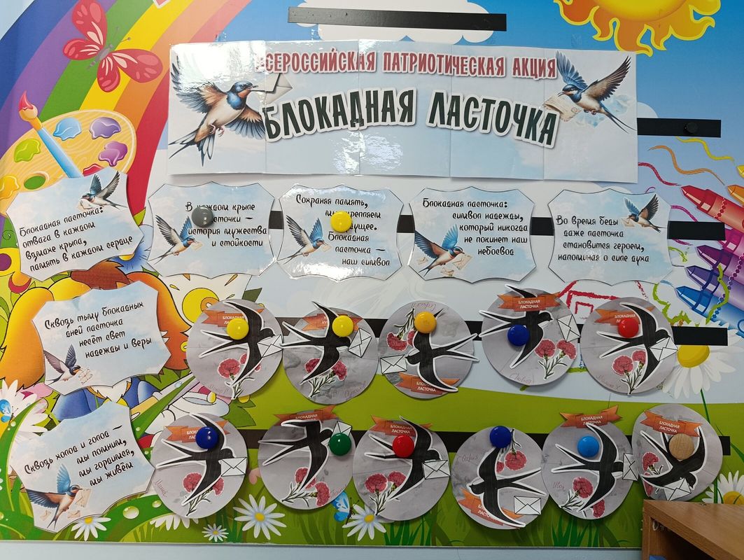 Дети посмотрели отрывок из документального фильма о Ленинграде в период блокады, познакомились с новыми понятиями: «Кольцо блокады», «Прорыв блокады», «Бомбоубежище», «Дорога жизни», «Защитники города». Узнали, что хлеб выдавался строго по талонам-карточкам и норма хлеба и для ребенка и для взрослого человека была очень маленькой. Послушали песню муз. А. Александрова сл. Лебедева-Кумача «Священная война». Так же дети узнали, что с 18 по 27 января в нашей стране проходит акция «Блокадная ласточка», посвященная войнам-защитникам, людям, проложившим "Дорогу жизни". Дети с большим удовольствием приняли участие в акции, смастерили своих почтовых ласточек. А завершили мероприятие песней «Пусть всегда будет солнце».